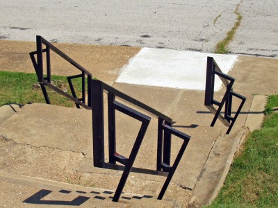 …like these slanting rectangle hand rails leading from the lower level parking lot on the south side of the building.