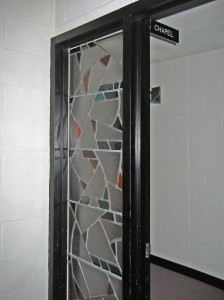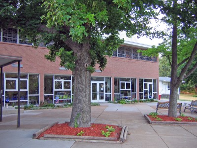 This is the 2-story rear of the building, as seen from the south parking lot. Upstairs is a small chapel and administrative offices with stained glass fenestration. Below are light-filled classrooms and a small auditorium.