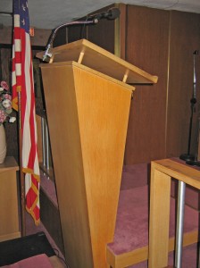 Blonde, Danish modern fixtures are carried throughout the lobby and auditorium of the church. The angles of this podium on the alter are gravity-defying and maddeningly cool.
