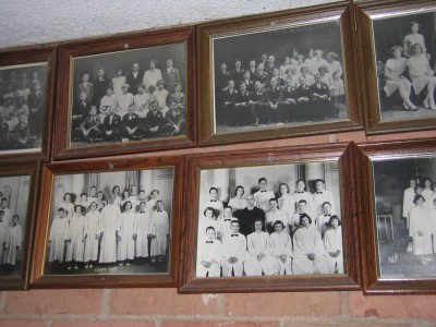 In the lobby, above the original metal coat and hat racks, remains a pictorial history of parishioners (and their sports trophies). Above we see what looks the folks from the 1930s-40s, and below…
