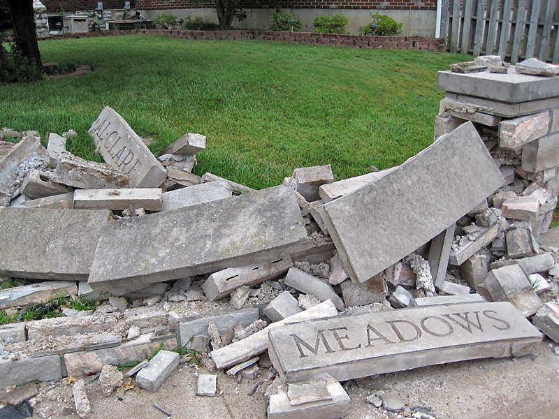 Based on current costs of masonry repair and labor, I naturally assumed this entry marker was eternal toast, that the pieces would be carted off, the homeowners lawn repaired, and Al-Clare would continue unperturbed with a lopsided entry.