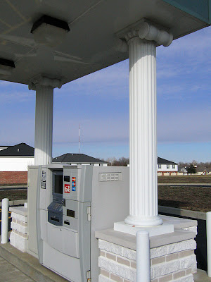There’s much to admire about this 1955 school building in Alton. I love how the series of saw tooth entry doors are echoed in the picture window to the left. And the tri-colored tile work of the columns creates a pattern that feels both jaunty and whimsical. I even love how they have retained the early 1970s-era trash containers, which creates a tableau of the school evolving over the decades.