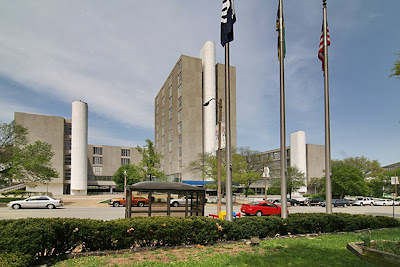 One of two round white buildings on Lindell, it looks like the curvy female answer to the boys-will-be-boys clubhouse across the street. But this building was erected in 1977! As early as 1942 the Automobile Club was listed in this same spot, and they certainly waited a long time to join in the CWE urban renewal.