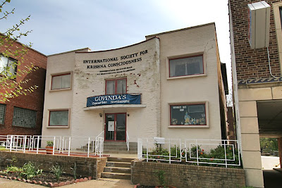Built in 1909, it was listed as a private residence of Sara Wesnick in 1942. By 1960 it had become commercial, housing multiple small business at once until it went vacant in 1973. The International Society of Krishna Consciousness have been here since 1980. The new facade is so geometrically simple and graceful that I want to pinpoint it as late 1940s. Does anyone have an accurate read on the remodel?