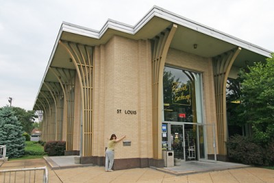 Toby Weiss of B.E.L.T. hugging the former Buder Branch of the St. Louis library in St. Louis Hills in South St. Louis, purchase MO.