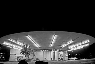The unique flying saucer building was originally built in 1967 as a Phillips 66 gas station. It had a unique pedigree, as well. At the time, Phillips 66 was known for its bat-wing model, a nation-wide design that came down from their corporate office. But in this rare case, the same architects that designed the rest of Council Plaza also designed this special edition of Phillips 66.