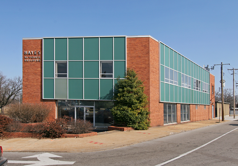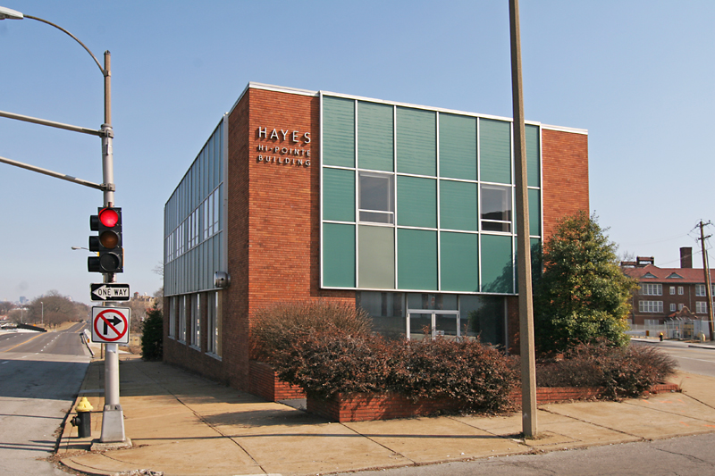 Aside from all the challenges, it’s a sharply tailored slice of mid-century modern in the Hi-Pointe neighborhood. City records claim the building is from 1905, which is absurd, both stylistically and construction-wise, and a 1958 aerial calendar shows nothing much at all on this odd plot of land. By 1961, the City directory lists Alfred W. Hayes & Co. (the building’s namesake) and Algonquin Investment Co. at this address (plus a couple of physicians), and the architecture matches that year.