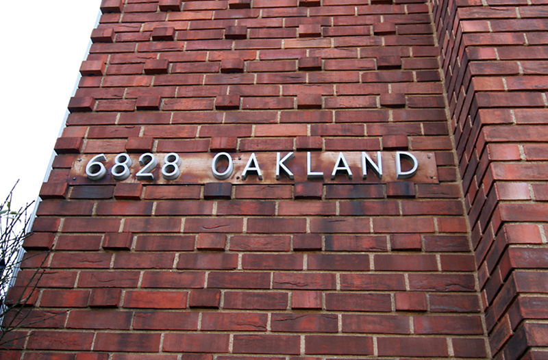 Getting on foot to try and get to the Hayes Hi-Pointe Building is almost as challenging, because of all the vehicles that are either a) confused about which way to turn, or b) irritated at those who don’t know which way to turn. Photographically, the building itself is often encumbered with for sale/lease banners, overgrown landscaping (see above) or – as on this day – a boarded up window on the Oakland Avenue side, which was a fresh accident because the shattered glass was still spread across the sidewalk.