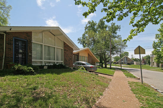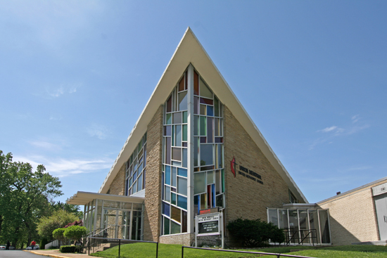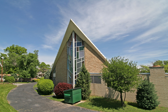 A carload of us architecture fanatics were heading east on Page Avenue after a long day of photo adventures brought short by the setting sun. I glanced out the window to the south and saw a stained glass beacon pointing straight toward me, then it disappeared. I wasn’t sure if I really saw it, but quickly asked for them to turn the car around, let’s investigate.