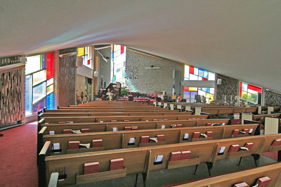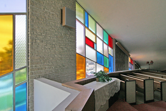 These shafts of stained glass follow the angle on both sides of the church, and the experience of watching them ascend as you walk into the main auditorium really does lift the spirits. The beauty of mid-century modern church architecture is that they did finally have the means to recreate the poetic movement of faith and ascension. Today’s brick box stadium churches really do a disservice to the spirits they worship.