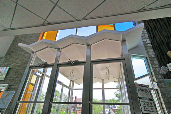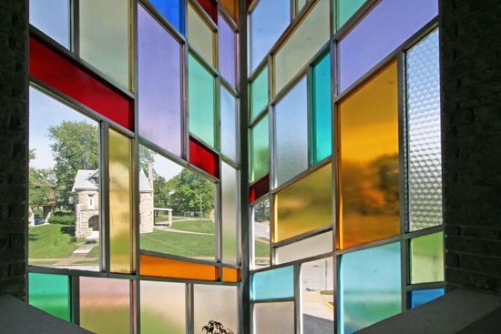 • All of the stained glass panels and aluminum framing had to be fabricated on the site, rather than in a shop, as is typical. The architects had drawn a general map of how the glass should be laid out, but they had to be in person to see how it would actually pan out. There are panes of clear glass in front of the stained glass to protect it.
