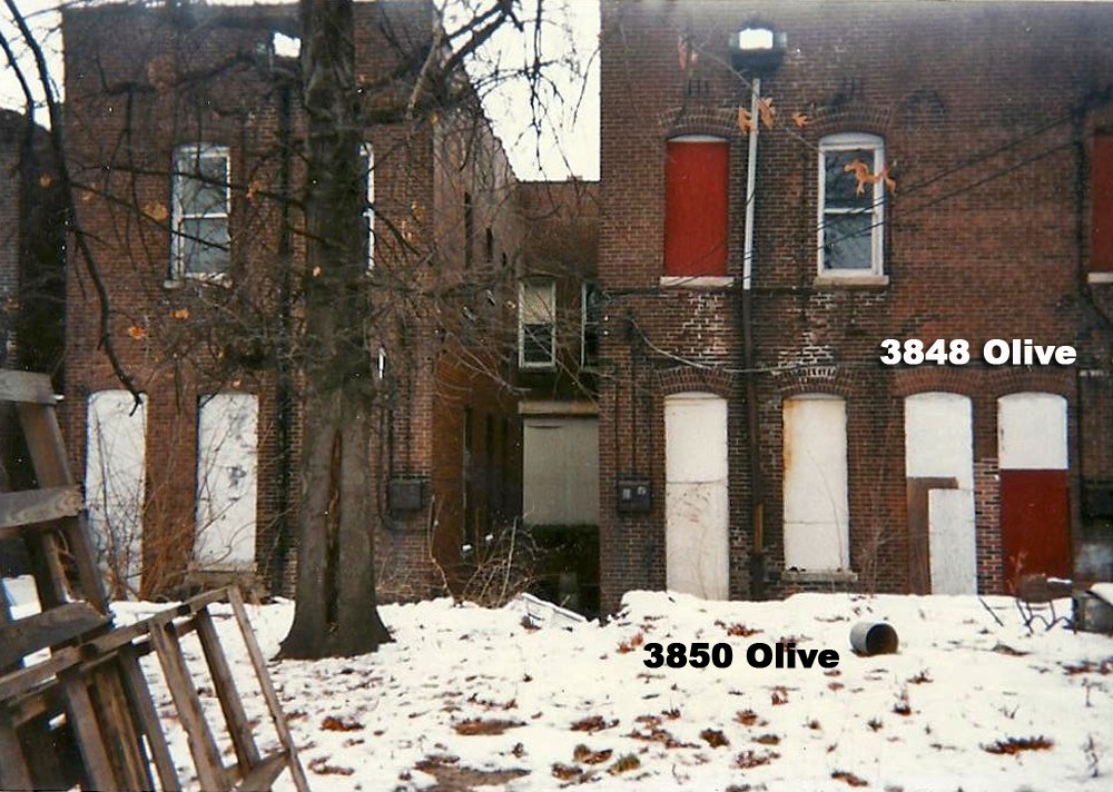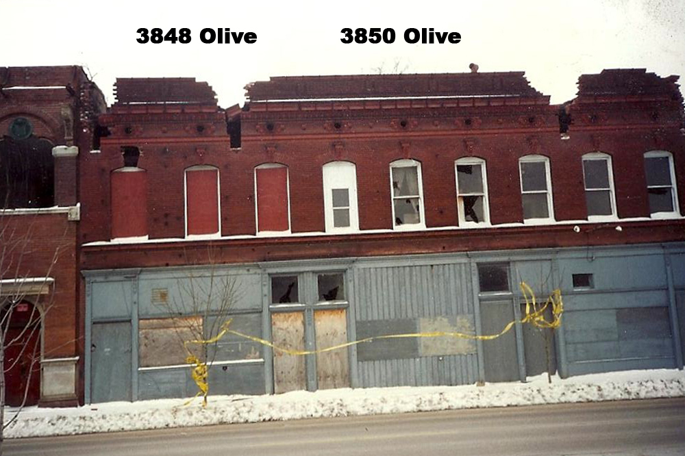“I lived at 3850 Olive St. near the Vandeventer Ave. intersection, from 1947-1954. The street was very busy then – lots of shops, and bars and a small department store across the street, the streetcar line ran down Olive. We lived in an apartment above my uncle’s bakery, Sausel’s (new-born Roland is shown with his family in front of that bakery, above) where my father worked. Stories about the brothel next door at 3848 came from my mother, as I was too young to know.