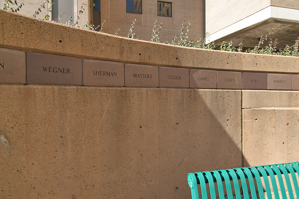 Dr. Master’s office and practice was on the 3rd floor of this building, and other than the exterior facade and some molding and terrazzo flooring touches at the entrances, everything has been remodeled countless times since the 1950s. Very little about Master’s and his ground-breaking work remains within the record books of the hospital or Washington University. Local theory is that ultra-conservative St. Louis academia still finds it offensive to acknowledge his pioneering sex studies. Though his last name does make the list of blocks inside the circular wall of this outdoor smoking lounge in front of the building (below).