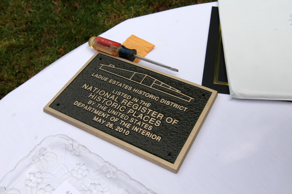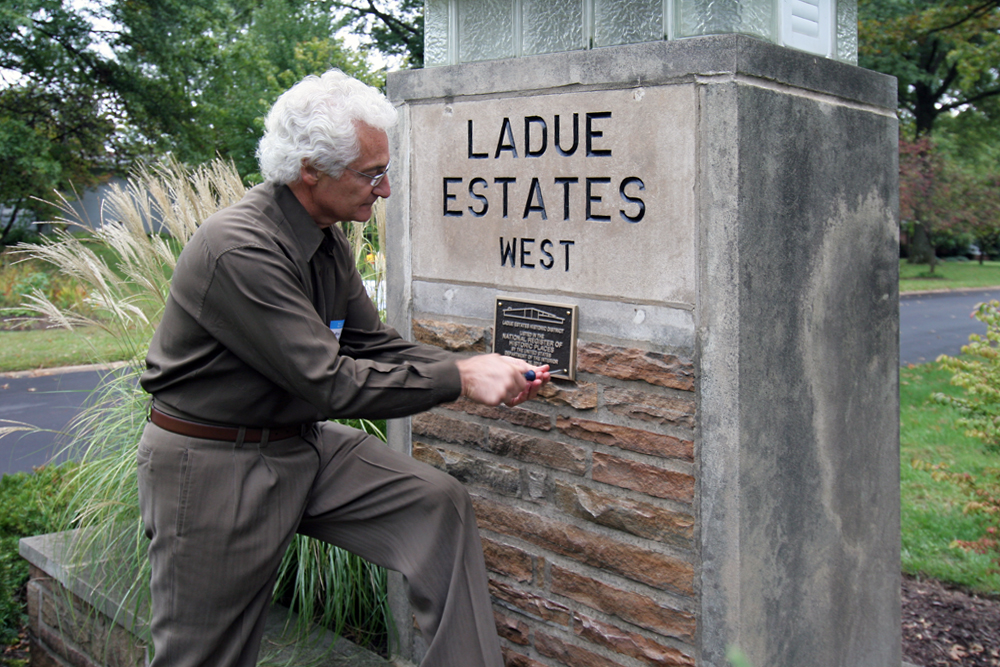 But in the face of fears that a lack of architectural appreciation and zoning laws will tear down important chapters of St. Louis history comes the first ray of hope: Ladue Estates was added to the National Register of Historic Places in May of 2010. And on October 1, 2010, St. Louis preservation luminaries such as Esley Hamilton and MiMi Stiritz were at the intersection of Ladue Road & West Ladue Estates Drive for the dedication ceremony.