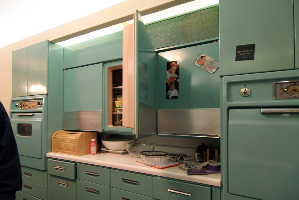 I have a set of those Seafoam steel GE cabinets awaiting installation out in the garage! I got the matching electric cooktop but, sadly, I was unable to get the wall oven and matching cabinet or the matching wall fridge. They would have required some demo work and I was just allowed to retrieve the cabinets that had already been removed. There was a Pink wall fridge (that had sadly been painted avocado) in the garage as well but alas, I couldn’t get it either. Eh, seems like it would have been too much work to properly install anyway.