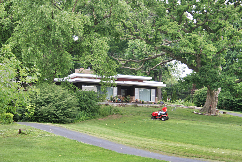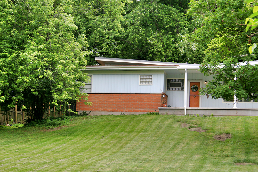 Built in 1958, the 1,607 s.f. home sits on nearly an acre of land. It is unabashedly modern with its multi-levels of flat roofs and large expanses of glass to peer down the steep hill in the front yard. Every time I pass by with a camera, the newest owner is out on his riding mower, and I’m working up the courage to ask him if I can get closer, maybe take some pictures inside.