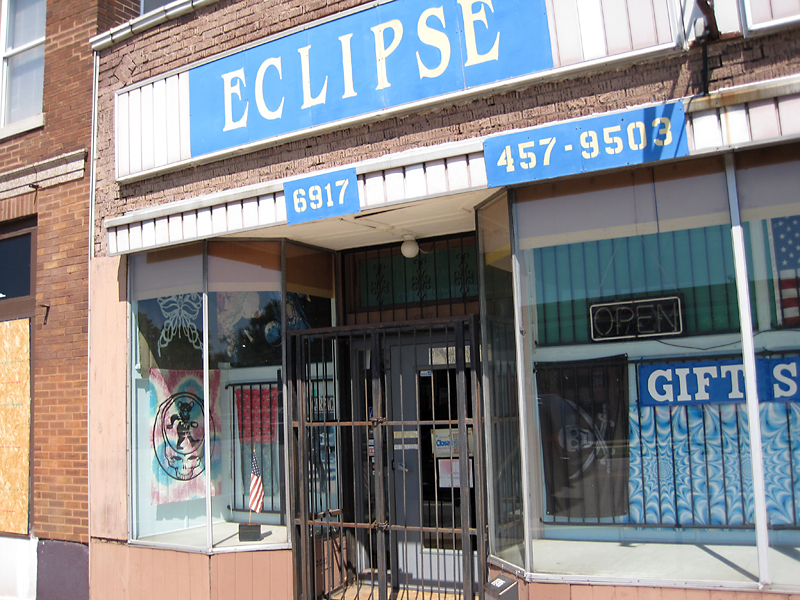 The head shops are divided by a building all vacant and boarded up, slightly forlorn, but look at that entrance!