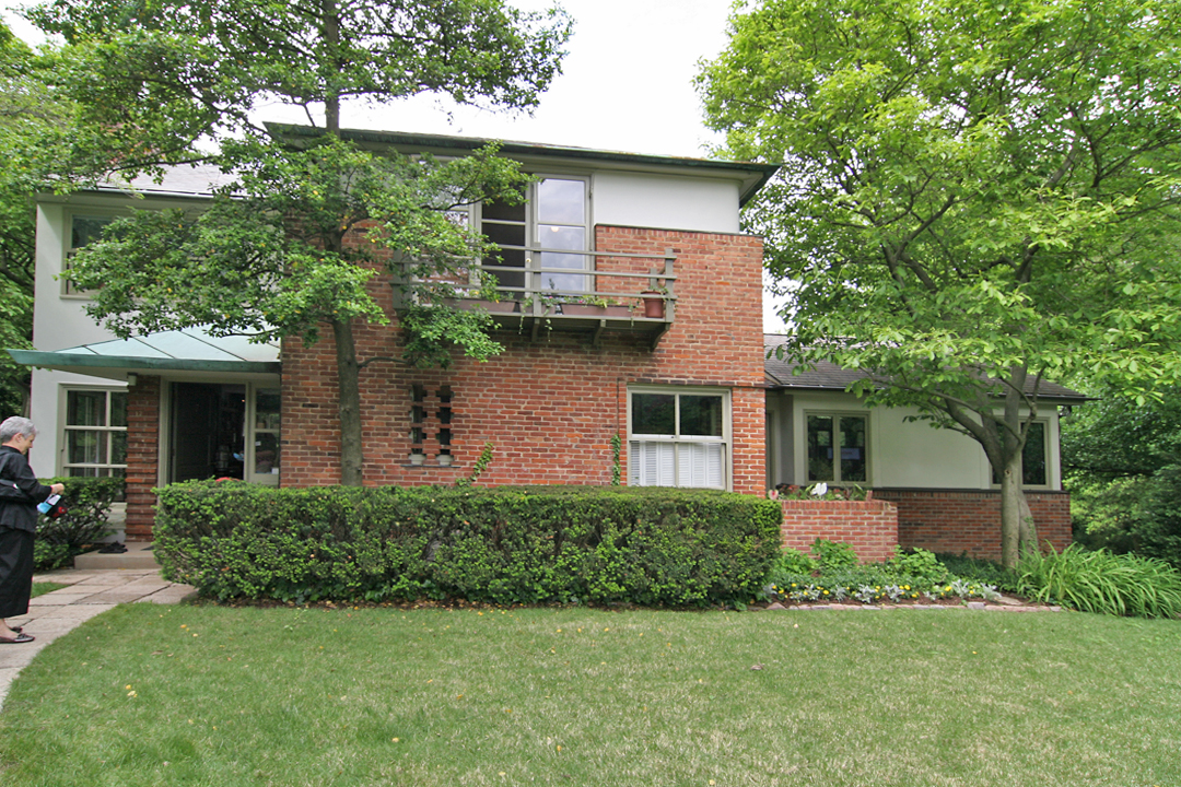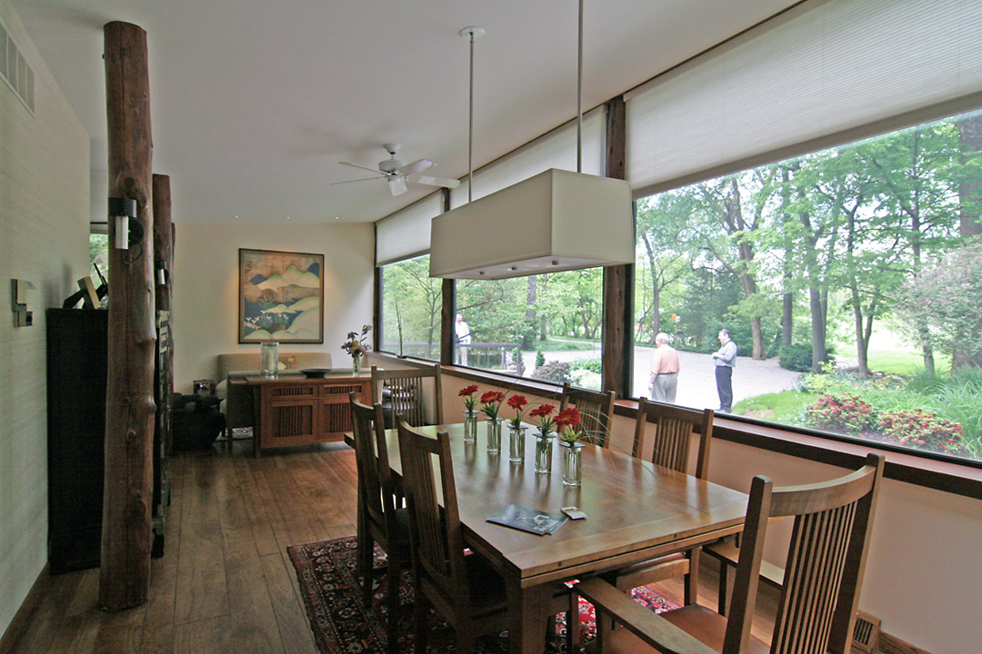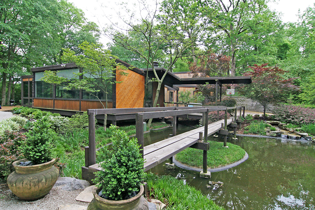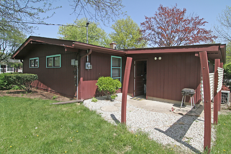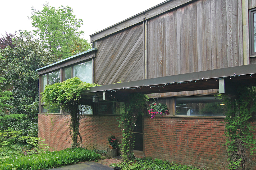 There are 3 distinct outdoor lounging areas around the house: the front yard, private patio by the side door off the living room and the grilling area show above outside the back garage door. I love the bent wood posts; adds some subtle curves to a rigorous pattern of straight lines.
