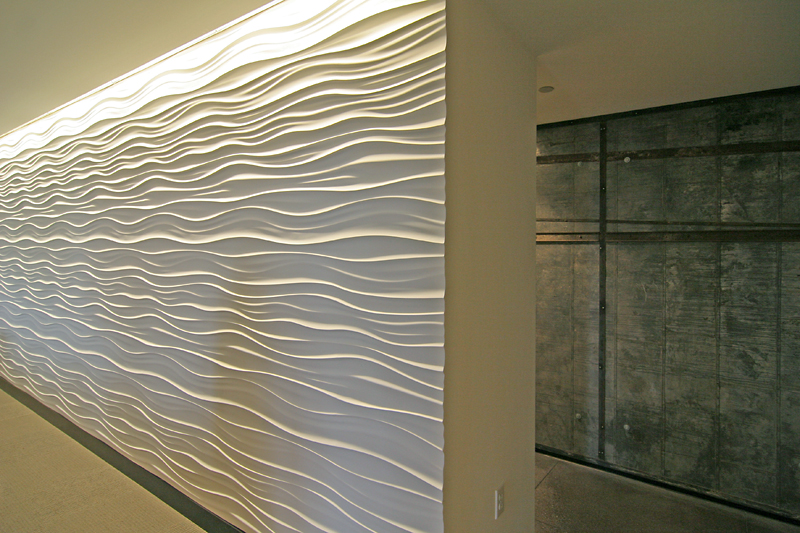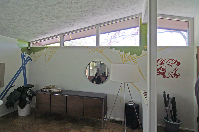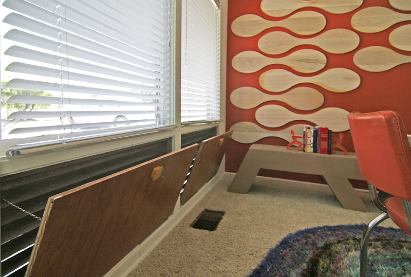 I was particularly charmed by the wood panels that open up to let in air, a clever way to get ventilation when you have fixed picture windows. Also note the burnt orange wall with the raised, wooden appliques. The wall is in-progress, and I noticed a small stack of them out in the garage, waiting to be affixed to the wall. It gave the charming impression of making ones own puzzle pieces and casually putting the puzzle together in ones spare time.