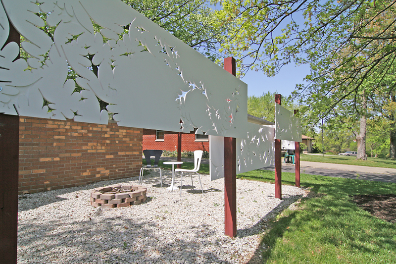 Wil designed and fabricated the plastic panels that make this unique fencing that provides partial privacy for a front patio seating area with a fire pit. He traced the shadows of the leaves from these very trees as the sun shown through them to create the pattern.