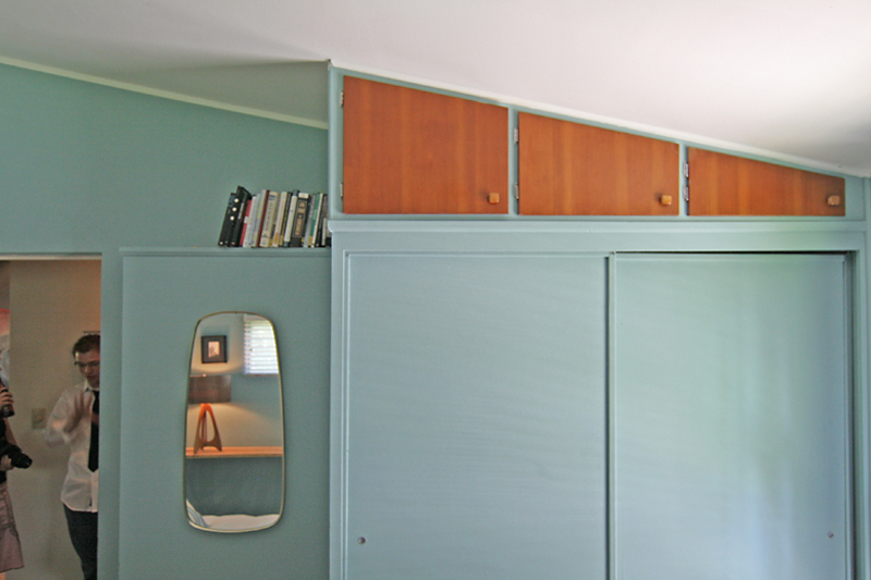 Each of the bedrooms has extra storage above the sliding door closets, and these cabinet doors match the ones under the dining room window. Just love how these doors match the slope of the ceiling. It’s these tiny details that add character while solving the problems of where to stash our stuff.