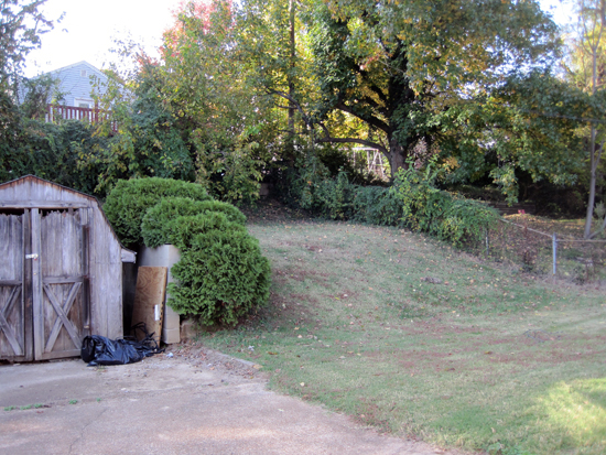 Here’s the backyard in 2011. The hill doesn’t seem as steep as it did back in the day. My being older is part of it, I’m sure, along with natural settling and erosion. Note the cinder block wall to the right of the sad, faded little utility shed.