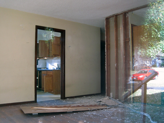 Whomever is working on the house is tearing down the wall between the living room and one of the 3 bedrooms. Also note the kitchen.
