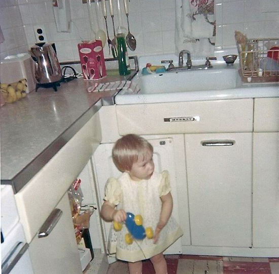 Anyone who knows their metal cabinets, can you decipher what that label to the right of my head says? I can’t get the picture any larger to figure it out, so could use your expertise. Oh, and I still have the GE handmixer you can see hanging on the wall. Still works perfectly!