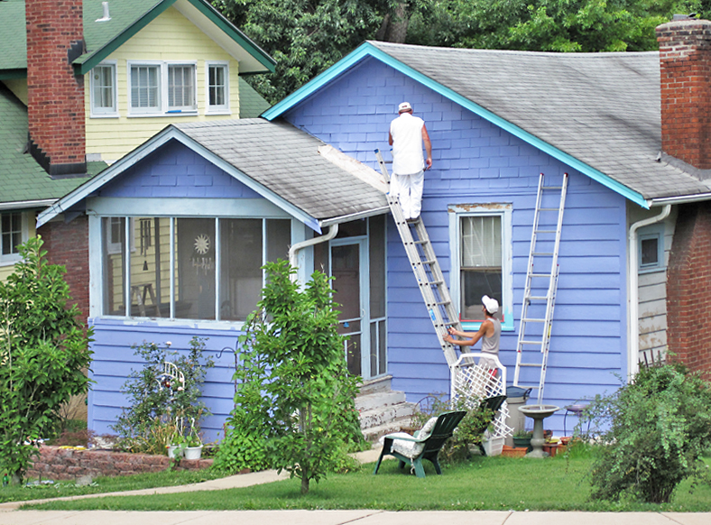 Painters going in for the second coat of a saturated, perriwinkle purple on a home beside the train tracks.  Yeah, the roof needs some attention – structure- and shingle-wise – and replacement windows are overdue. But that type of maintenance costs.