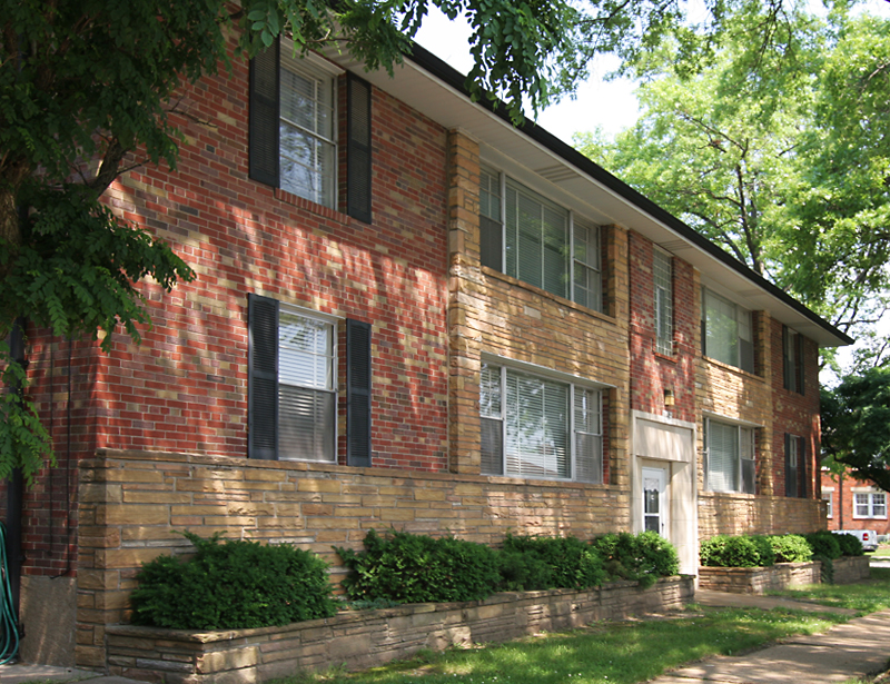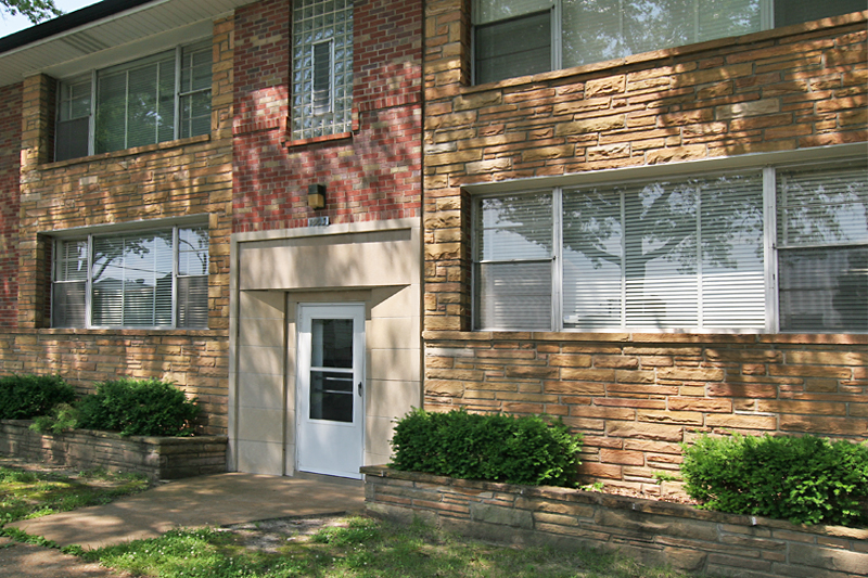 Here’s a typical scene in St. Louis Hills – a mid-century modern apartment building nicely appointed with various stone and brick textures to create a pleasing geometric palette. I can imagine living here, with the generous fenestration that surely makes the rooms seem comfortably large. But then something horrible happened somewhere along the way.