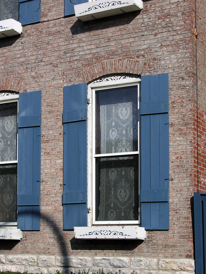 Same goes for these shutters on a Benton Park building. These even have the latches to hold the shutters against the building when not in use. Plus, they are real wood and painted a sumptuous shade of blue that contrasts nicely with the red brick. Well done.