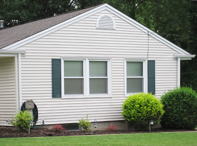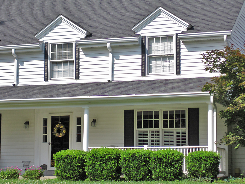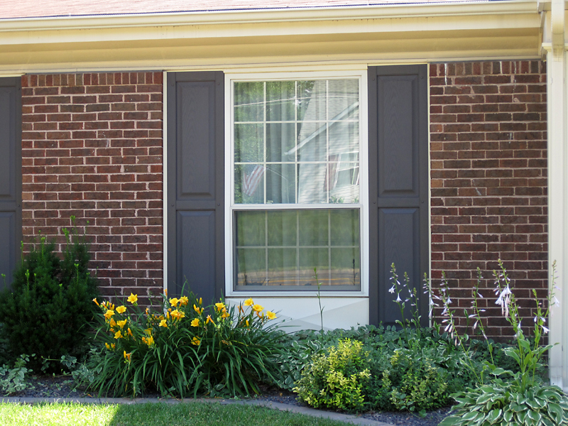 Sometimes the placement of a window on a modern home strictly forbids you to install shutters, like the left-hand window, above. To carry on the theme would require ordering custom shutters. Off-the-shelf vinyl shutters in standard sizes average $35-$50 a pair, so this homeowner was willing to spend, say, $90 to trim two windows, but they were not willing to spend custom dollars for that last window. This seems a wise decision when compared to…