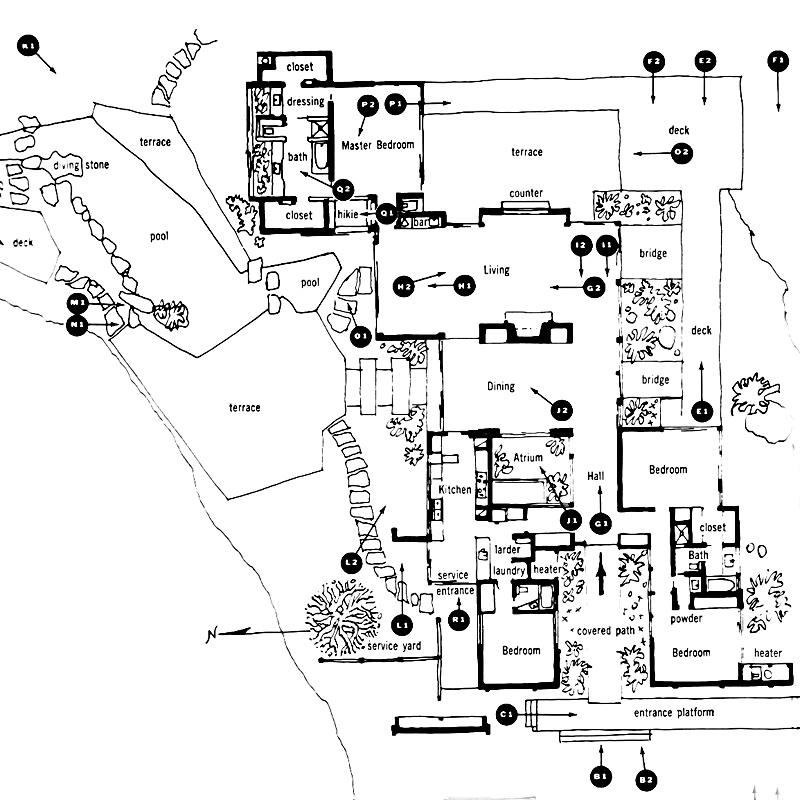 In one remarkable chapter of his book, Shulman shows the interior and exterior plan of a home in Bel Air, California, annotated with the exact location and direction of his camera for the 33 shots he took of it for the July 1961 issue of House & Garden. He then shows you all 33 photos and explains why he composed as he did, and the emphasis is always on making the house understandable to the layman.