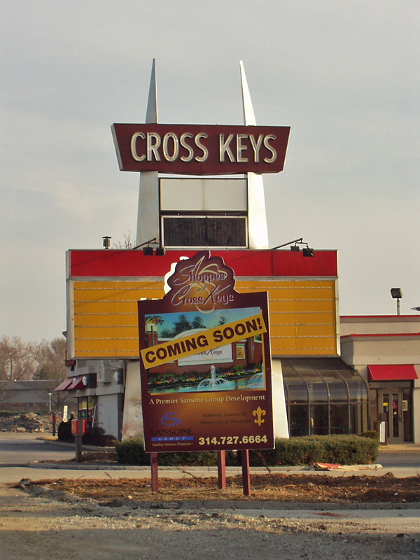 Back at the original Cross Keys, this is a detail of what was originally a Krogers grocery store, which disappeared around the time Cross Keys also got a Schnucks. The center of this retail oasis was an indoor mall, but I can’t remember a time when it was as lively and thriving as the open-air stores along the perimeters. Actually, I remember the mall being a bit creepy.
