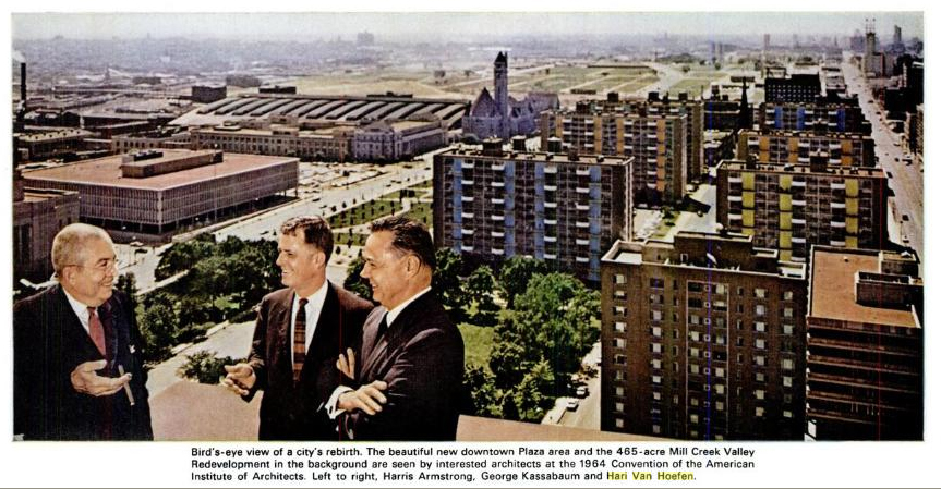 I ran across this picture in a 1964 issue of LIFE magazine, and gasped with pleasure. Click to enlarge it and see Harris Armstrong, George Kassabaum and Hari Van Hoefen floating above downtown St. Louis. The swooning teenage-girl thrill I got from finding this photo reminded me of the first time I saw this: