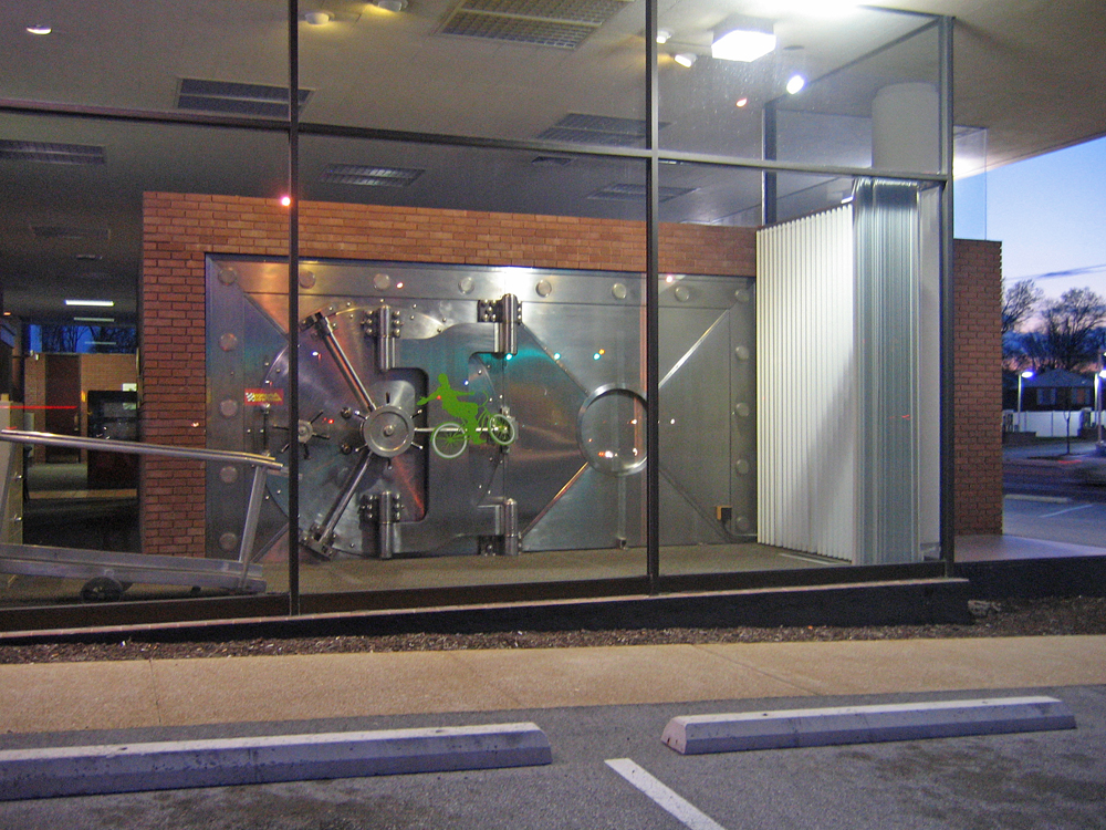 At night, the virile and industrial bank vault is left exposed, but during the day, those vertical blinds keep it hidden. Back in the day, it was always exposed. If anyone knows why the current inhabitants keep this curious blind parting schedule, please do share.