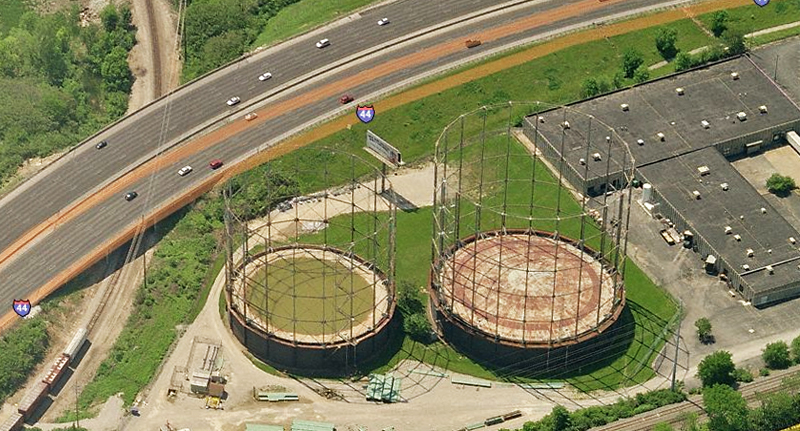The natural gas storage tanks owned by Laclede Gas were erected in 1925 and 1941, and have been inactive since 1995. They sit on just under 6-acres of land, which was purchased by a development firm that plans to grade and seed the soon-to-be-vacant property so it looks “nice” while trying to attract a new owner to build on the site.