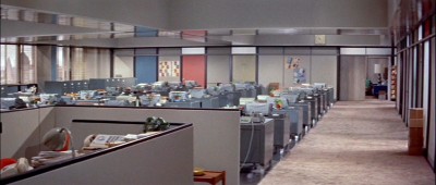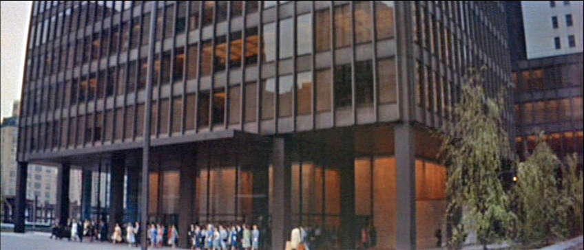 The Living Room comes back for another great scene involving a party Jenny throws to lure blind Tye into her private world. She is the only woman in a sea of white men (and one lone black piano player) who must have been instructed to wear navy blue suits so they would coordinate with the brown tiger wood paneling and the white George Nelson pendant lamps.