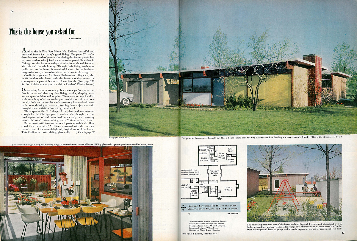 The September 1953 issue of Better Homes & Gardens (courtesy of Nathan Wilber) devoted about 13 pages unveiling this model after spending the better part of a year quizzing families about what they wanted in a new home. The findings were worked into a plan by architects Brooks Buderus and Gerald Siegwart, and 40 builders across the country erected the homes as part of the National Home Month. In Kirkwood in 1953, Burton Deunke builders had just begun the Craigwoods subdivision, and added the BHG Five Star Home into the mix.