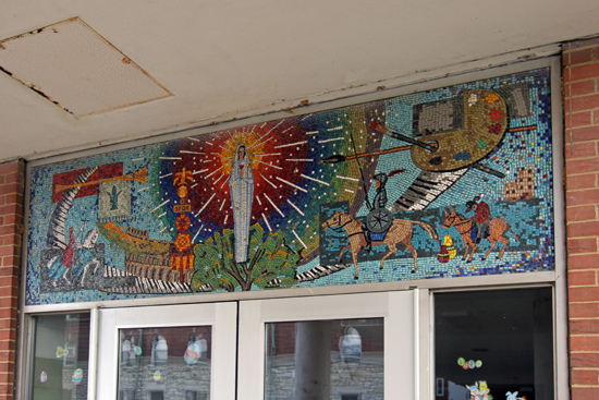 The gymnasium was built 2 years before the high school, and it’s interesting that sports came before a high school, proper. The gym itself has a rounded roof resting on concrete pillars, which are filled in with glass block. The entrance has the light, overtly modern airiness of the early 1950s. See the very first photo above to see the whimsical font on the building’s corner stone – it feels like the opening credits to a Doris Day movie. Considering the spiritual and educational gravity of the place, it seems a bit cheeky. But I love it.