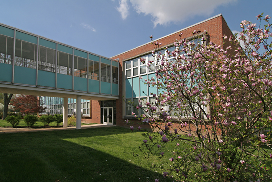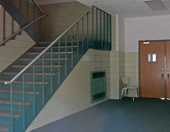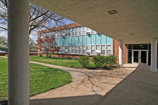 As it is approached from its main entrance on East Ripa, you first see the L-shaped high school erected in 1955. It presents a staid appearance with its brick and glass block, even evoking a 1940s institutional feel.