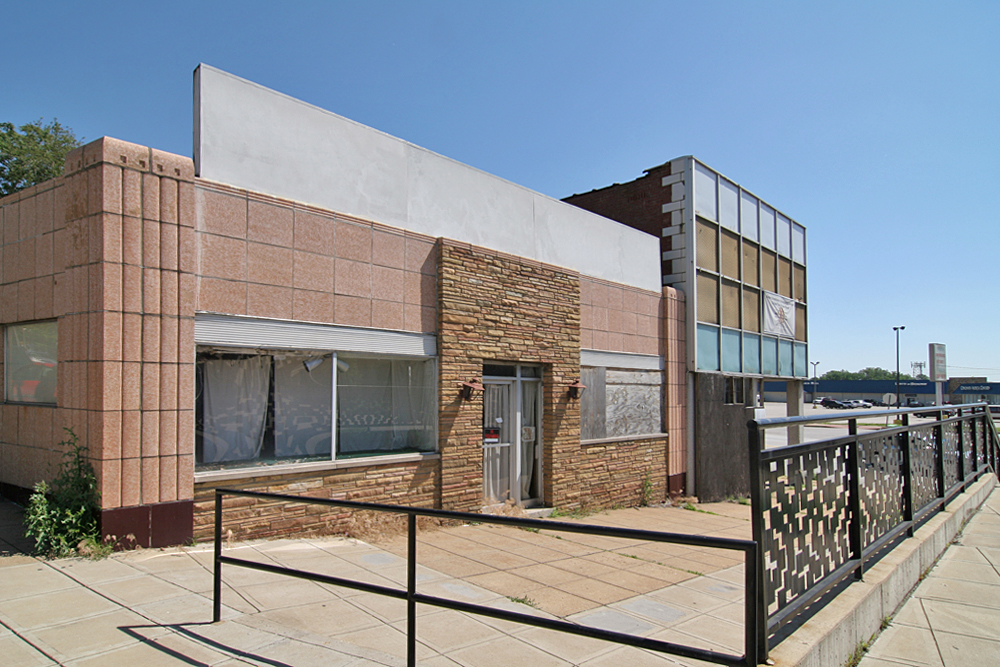 And we head down Muriel to North Broadway, where we return to the building that started our tour – The Medical Center. This 2-story brick building went up around 1925, and the place got a new face right around 1966 (see how the metal screen fastened to the brick).