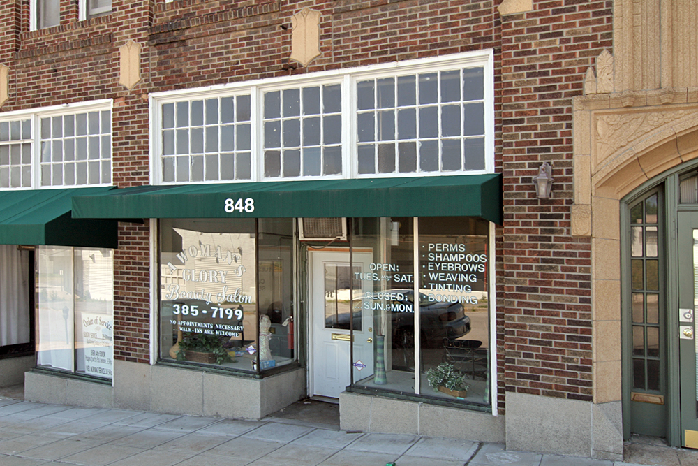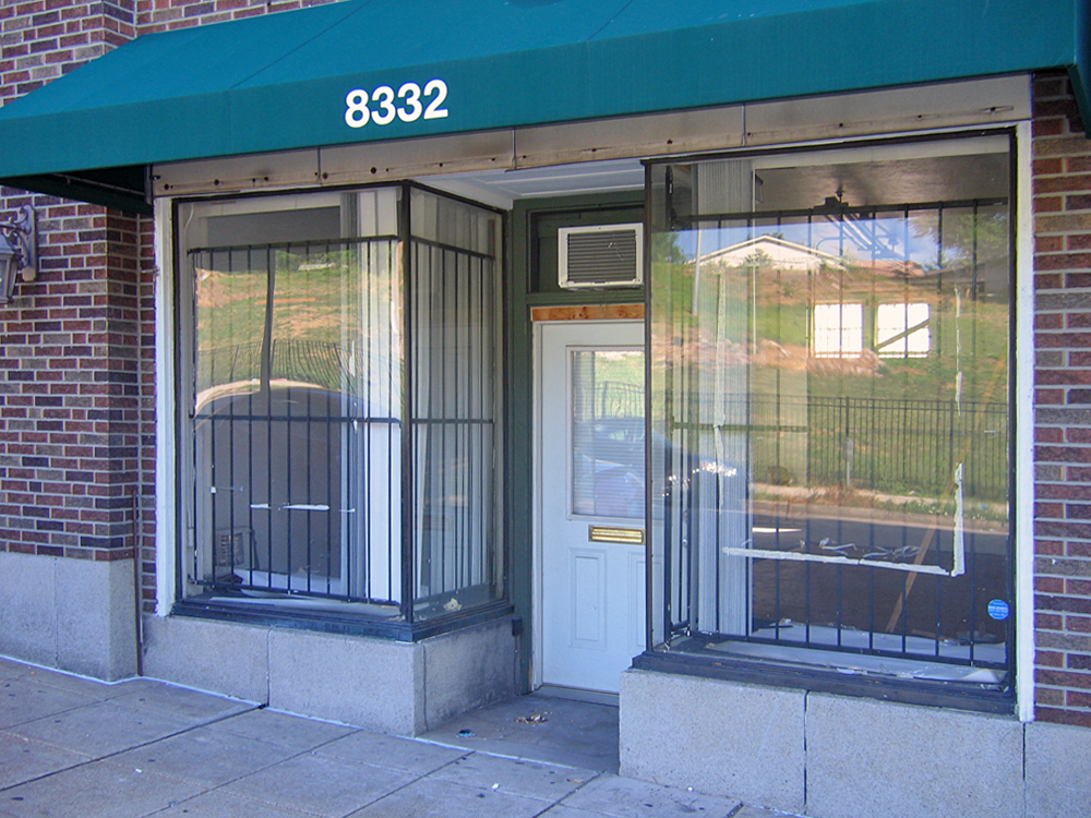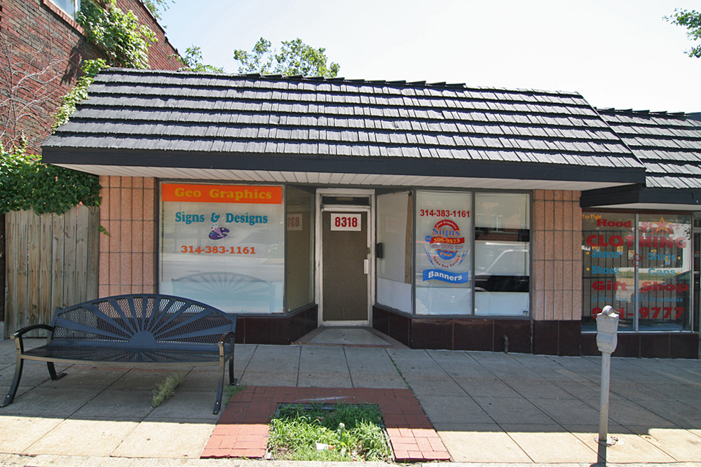 Storefront 8332 (shown above) started life as Baden Delicatessen and then became Howard’s Cleaners from 1941 to 1958 (how many cleaners did they need in one block?). From 1958 – 1990 it became a part of LeRose Flower Shop at 8330 Halls Ferry, and then converted back to single occupancy for Miss Connie’s Fashions and Matthews Realty & Investment. It has been vacant for most of the 2000s.