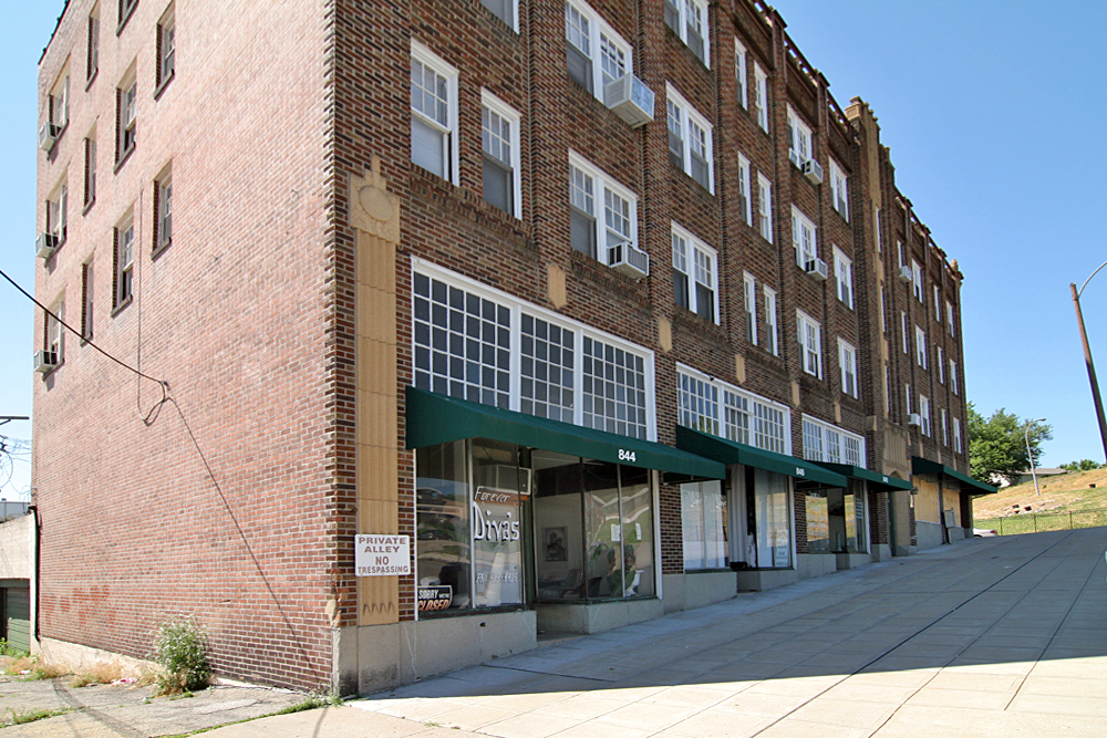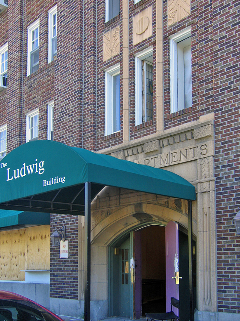Here’s the overall corner view of the Ludwig Building, showing how grandly it occupies the summit of The Wedge. Note window A/C units in some of the windows and know that the apartments have never been updated.